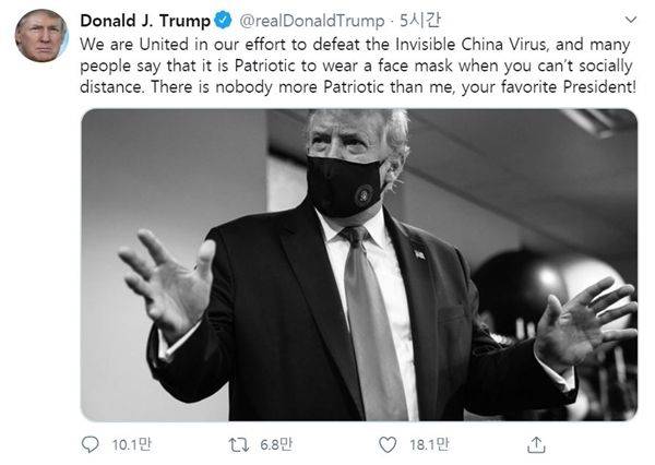 트럼프 대통령은 SNS에 마스크를 착용하고 있는 자신의 사진을 올리면서 "우리는 보이지 않는 '중국 바이러스'를 물리치기 위해 한마음이 됐다. 그리고 많은 이들이 사회적 거리 두기를 할 수 없을 때는 마스크를 쓰는 것이 애국이라고 하더라"고 밝혔습니다.