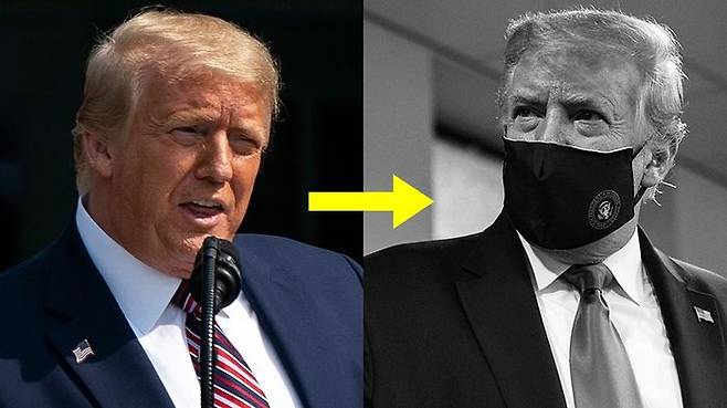 위 사진은 지난 11일 월터 리드 국립 군 의료센터 방문 당시 촬영한 것으로, 이날 트럼프 대통령은 코로나19 확산 이후 처음이자 마지막으로 마스크를 쓰고 공식 석상에 나타났습니다. 지난 5월 포드 공장을 방문했을 때 트럼프 대통령은 '노 마스크'를 고수하며 "마스크를 쓴 모습을 언론에 비춰 그들에게 즐거움을 주고 싶지 않다"고 당당하게 밝힌 바 있습니다.