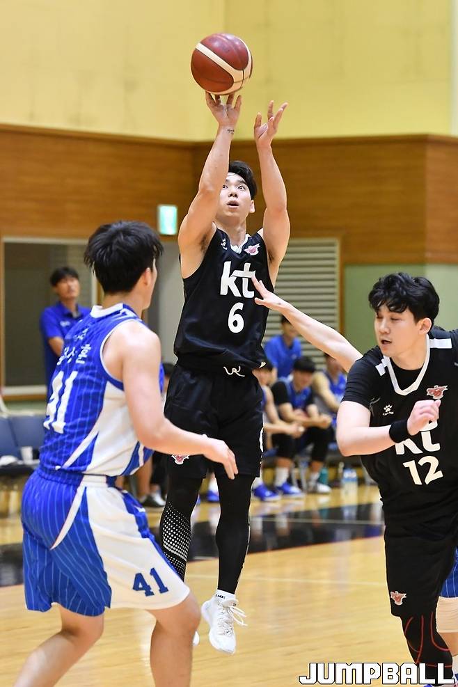 [점프볼=수원/홍기웅 기자] 21일 수원 올레 빅토리움(KT 연습체육관)에서 열린 KT와 중앙대의 연습경기. KT 김윤태가 3점슛을 시도하고 있다.