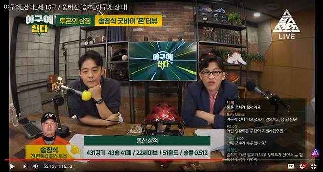 송창식 선수의 인터뷰는 SBS 정우영 캐스터와 이성훈 기자가 진행하는 온라인 야구방송 '야구에 산다'에서 지난 20일 전화로 진행됐다.