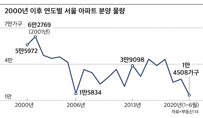 서울의 새 아파트 분양은 갈수록 줄어드는 추세다. 부동산114에 따르면 지난 2015~2017년에는 연평균 4만2370여가구가 분양된 반면, 최근 2년(2018~2019년) 분양 물량은 연평균 2만6400가구에 그쳤다. 올 상반기 분양 물량은 약 1만4500가구다.