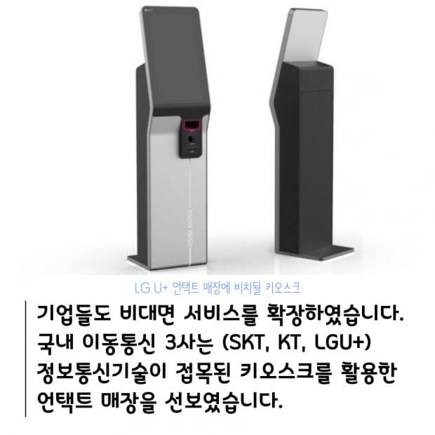 기업들도 비대면 서비스를 확장하였습니다. 국내 이동통신 3사는 (SKT, KT, LGU+) 정보통신기술이 접목된 키오스크를 활용한 언택트 매장을 선보였습니다.