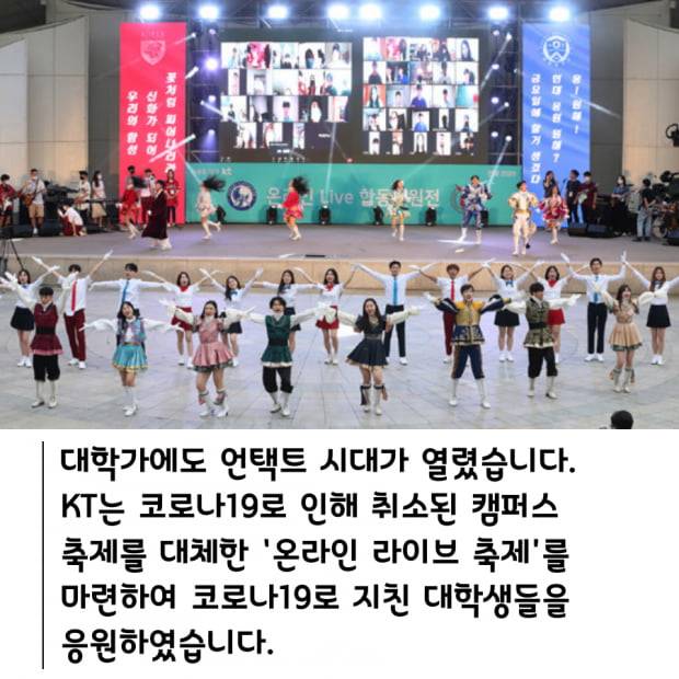 대학가에도 언택트 시대가 열렸습니다. KT는 코로나19로 인해 취소된 캠퍼스 축제를 대체한 ‘온라인 라이브 축제’를 마련하여 코로나19로 지친 대학생들을 응원하였습니다.