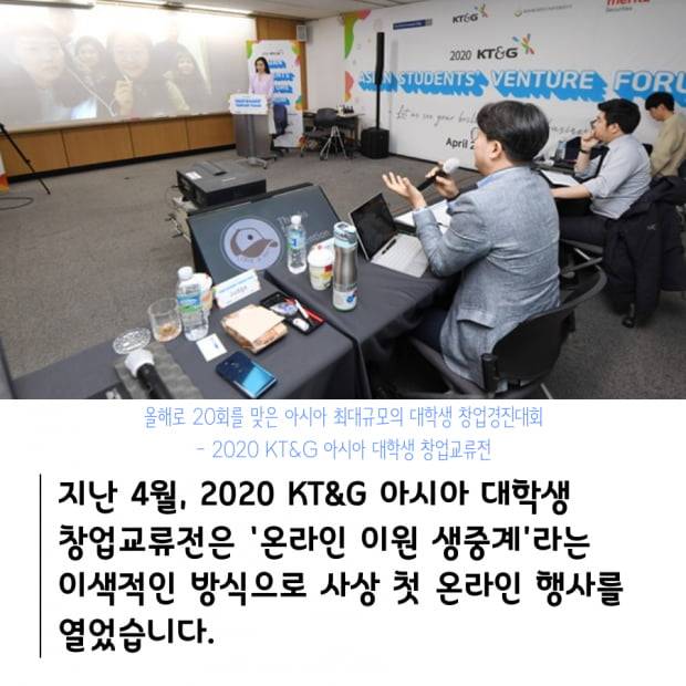 또한, 4월2일에 열린 2020 KT&G 아시아 대학생 창업교류전은 ‘온라인 이원 생중계’라는 이색적인 방식으로 사상 첫 온라인 행사를 열었습니다.