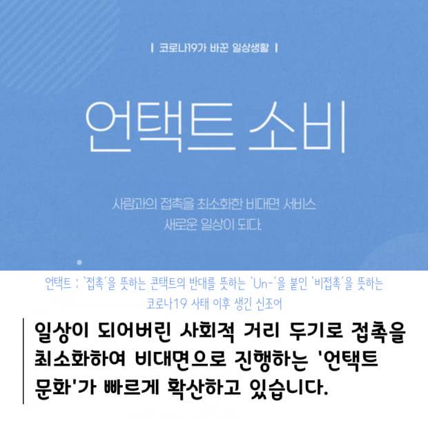 언택트란 '접촉'을 뜻하는 콘택트의 반대를 뜻하는 'Un-'을 붙인 '비접촉'을 뜻하는 코로나19 사태 이후 생긴 신조어 입니다.