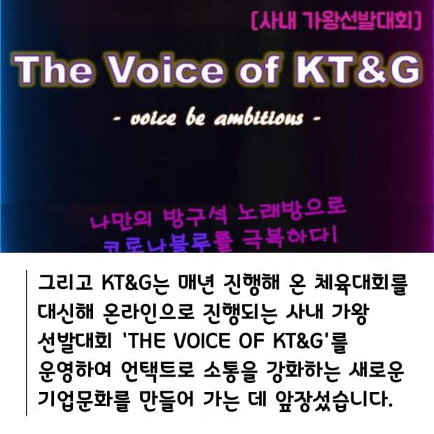 그리고 KT&G는 매년 진행해 온 체육대회를 대신해 온라인으로 진행되는 사내 가왕 선발대회 ‘THE VOICE OF KT&G’를 운영하여 언택트로 소통을 강화하는 새로운 기업문화를 만들어 가는 데 앞장섰습니다.