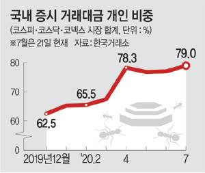 국내 증시 거래대금에서 개인 투자자가 차지하는 비중이 매달 늘어 7월에는 약 80%를 차지했다.