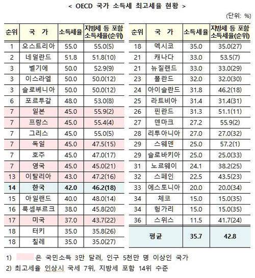 이로써 한국은 경제협력개발기구(OECD) 회원국 중 소득세 최고세율이 14번째로 높은 국가가 됩니다.
