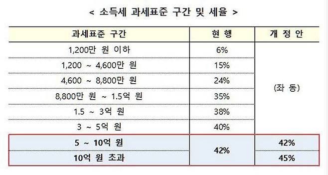 지금은 5억 원을 넘는 과표구간에 세율 42%를 적용했는데 앞으로는 5억~10억 원 구간에는 42%를, 10억 원을 넘으면 45% 세율을 적용합니다.