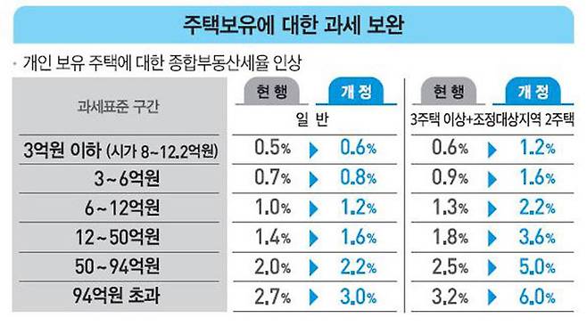 정부는 일반 종부세율은 과표 구간별로 0.1∼0.3%포인트, 3주택 이상이나 조정대상지역 2주택자에는 0.6∼2.8%포인트 인상할 예정입니다.