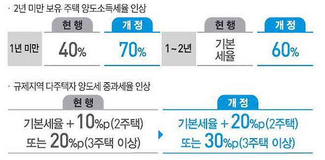 1년 미만 보유주택에 대한 세율은 40%에서 70%로, 1~2년 보유주택은 기본세율(6~42%)에서 60%로 올립니다.