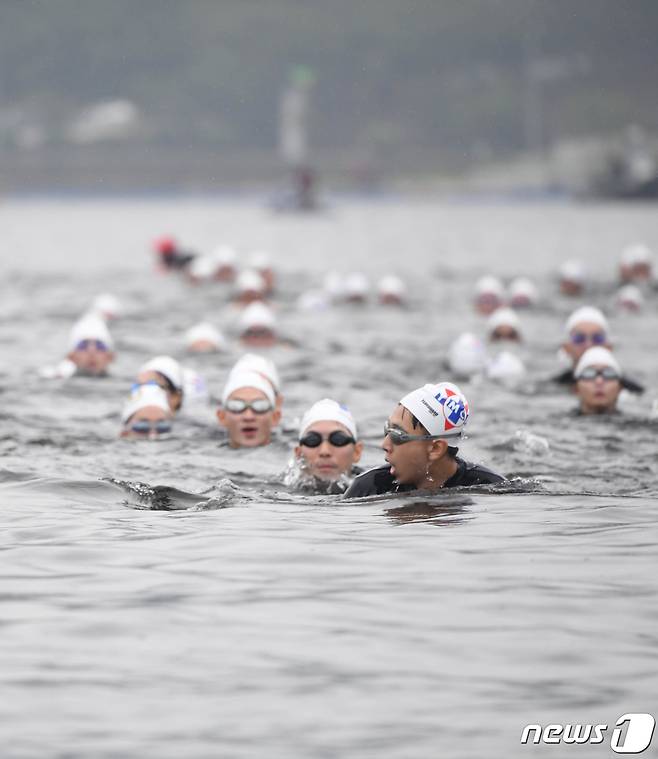 (서울=뉴스1) = 해군사관학교 생도들이 23일 경남 창원시 해군사관학교 앞바다에서 5km의 바닷길을 맨몸으로 수영하는 원영훈련을 하고 있다. (해군 사관학교 제공) 2020.7.23/뉴스1