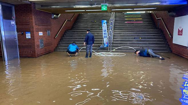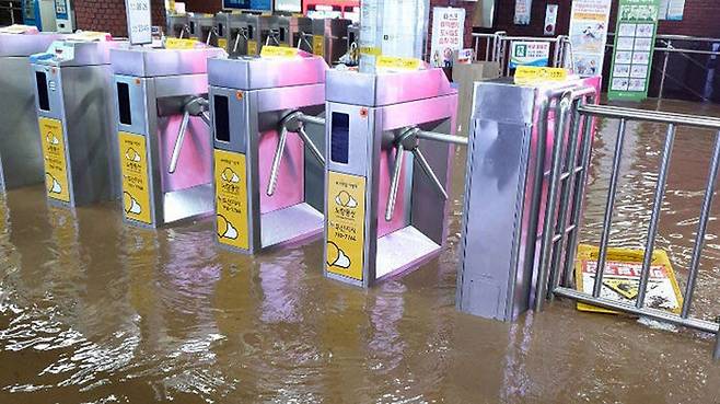 호우 경보가 내려진 23일 오후 집중호우로 침수된 도시철도 1호선 부산역 모습.
