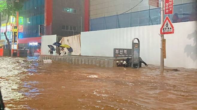 [현장 포토] 자동차 휩쓸리고 지하철역 물바다..부산 피해 상황