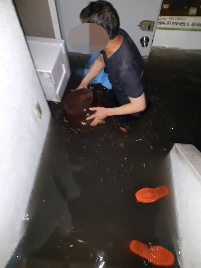 부산 동구 동천이 범람하면서 인근의 한 아파트 1층이 침수됐다.