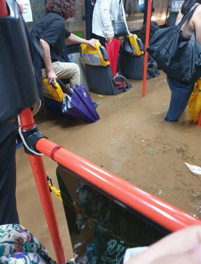 집중호우가 내린 23일 부산 한 버스에 도로 침수로 물이 차올라 시민들이 불편을 겪고 있다.