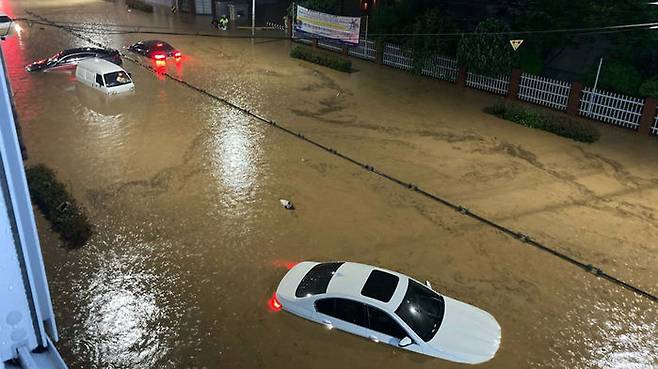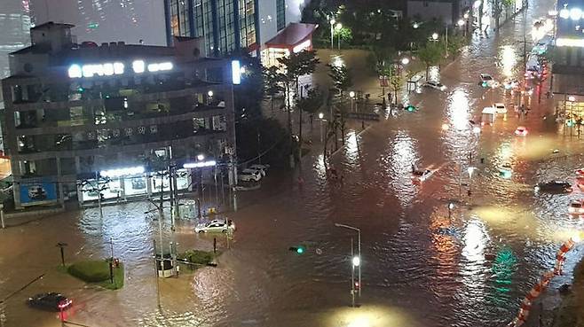 부산 연산동 한 도로가 침수 돼 차량이 물에 잠겨 있다.