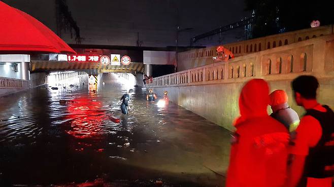 23일 많은 비가 내린 부산 동구 초량동 부산역 인근 제1지하차도에 출동한 소방대원들이 구조작업을 벌이고 있다. 이곳에 갇혔던 60대가 병원에 이송됐으나 숨졌다.