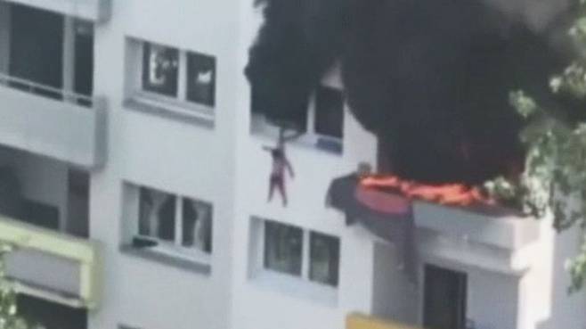 불이나 검은 연기에 화염이 솟구치는 아파트 발코니 아이 한 명이 위태롭게 매달려 있습니다.