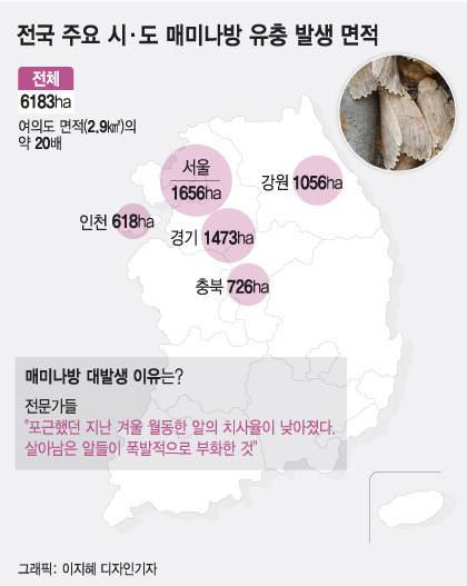 산림청 실태조사 결과 지역별로는 △서울 1676㏊ △경기 1496㏊ △강원 1203㏊ △충북 759㏊ △인천 618㏊ △경북 387㏊ 등 면적에서 매미나방 유충이 발생했다. 전라남북도와 경남 등 일부 지역을 제외하고 전국적으로 매미나방이 퍼져나갔다.