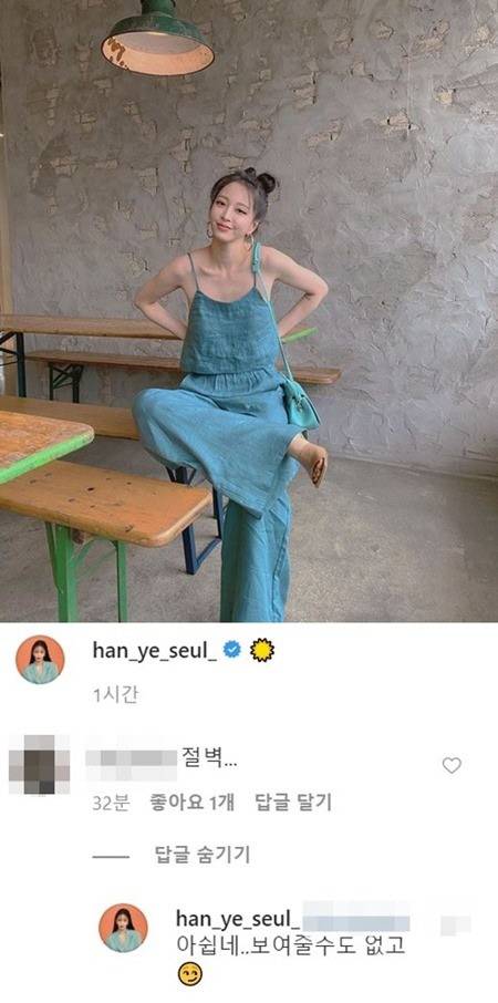 그러나 이때 한 네티즌은 "절벽"이라는 댓글을 달았고, 이에 한예슬은 "아쉽네. 보여줄 수도 없고"라고 직접 댓글을 남기며 속 시원한 일침을 날렸다.