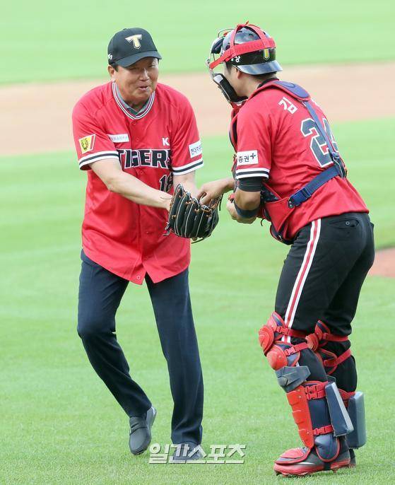 프로야구 KIA와 삼성의 경기가 25일 오후 광주 KIA챔피언스필드에서 열렸다. 선동열 전 야구국가대표 감독이 시구 하고 나서 포수 김민식으로부터 공을 받고있다. KIA와 삼성은 25일과 26일 경기를 '88고속도로 씨리즈'라 명명하고 1980년대 디자인으로 제작한 올드 유니폼을 입고 경기를 한다. KIA는 빨간 상의, 검정 하의를 한 원정유니폼을, 삼성은 홈 유니폼을 입는다.