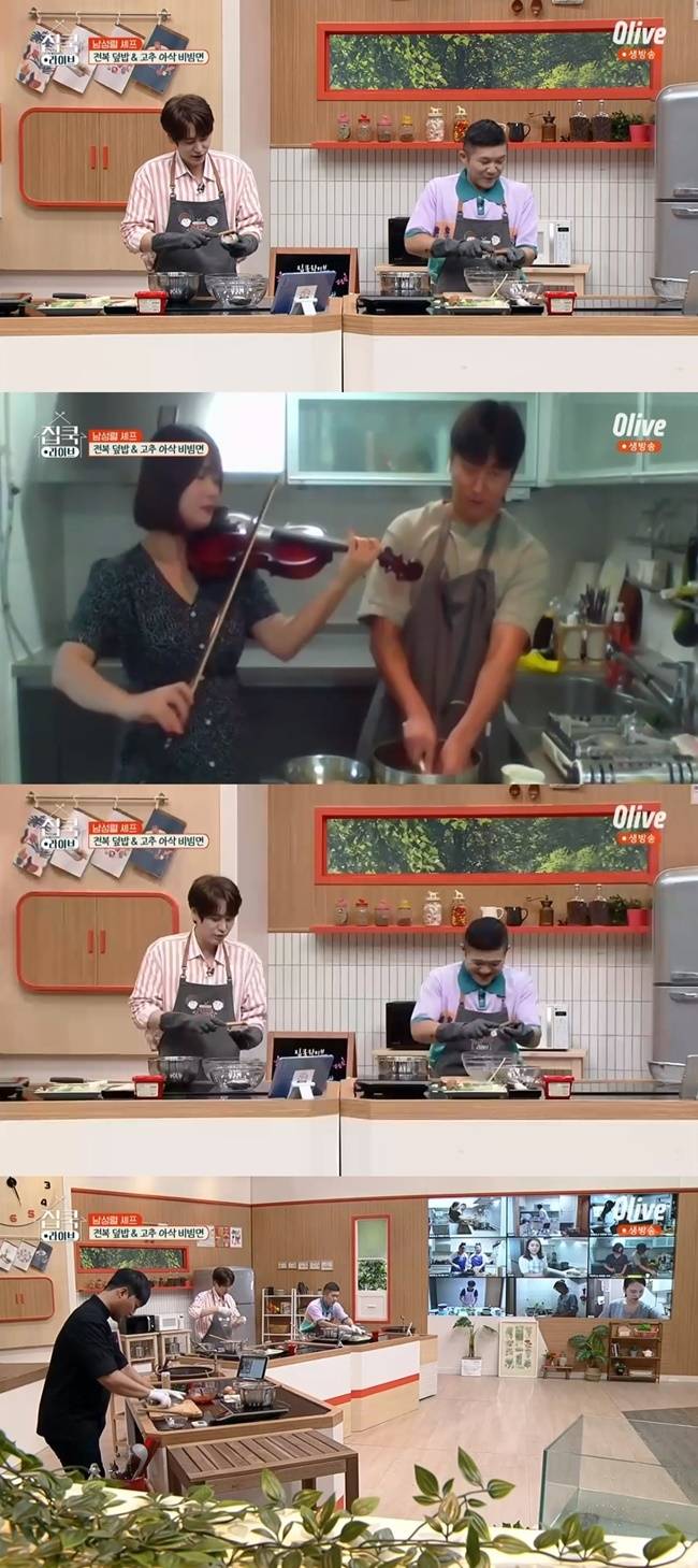 이에 수강생은 즉석에서 조세호x남창희가 부른 '조남지대-거기 지금 어디야?'를 연주했다. 그러나 실시간 시청자들은 "좀 대중적인 노래로 해달라"고 반발해 조세호를 머쓱하게 만들었다. (사진=Olive '집쿡라이브')