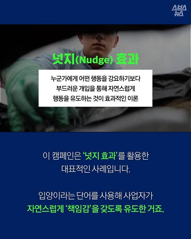 그 이유는 '넛지 효과' 때문입니다. 넛지 효과란 특정 행동을 강요하기보다 옆구리를 찌르듯 부드럽게 개입해 특정 행동을 유도하는 것이 훨씬 효과적이라는 이론입니다.