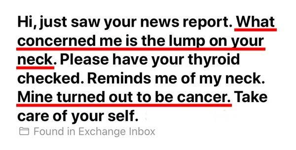 프라이스 씨는 이 이메일을 보고 처음에는 당황했습니다. "방금 방송을 봤는데 당신 목에 혹이 나 있는 게 걱정됩니다. 부디 갑상선 검진을 받아보세요"라는 긴 제목에, 내용도 충격적이었기 때문입니다. 메일에는 시청자라고 밝힌 수신자가 과거 자신의 목에 났었던 불룩한 '혹'이 프라이스 씨의 목에서도 보였고, 자신이 비슷한 증상으로 갑상선암 진단을 받았으니 확인해보라는 내용이 있었습니다.