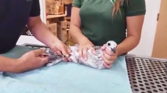 마스크를 먹이로 착각하고 낚아챈 건데요, 생후 4주밖에 안 된 송골매의 발톱에 일회용 마스크가 온통 엉켜버렸습니다.