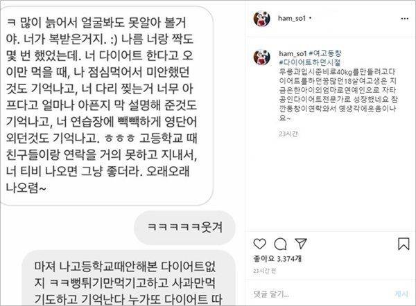 그는 "고등학교 때 친구들 연락을 거의 못 하고 지내서 너 티비 나오면 그냥 좋더라. 오래오래 나오렴"이라며 함소원을 향한 훈훈한 응원을 보내기도 했는데요, 함소원 역시 "맞아. 고등학교 때 안 해본 다이어트 없지. 기억난다"라며 함께 추억에 젖었습니다.