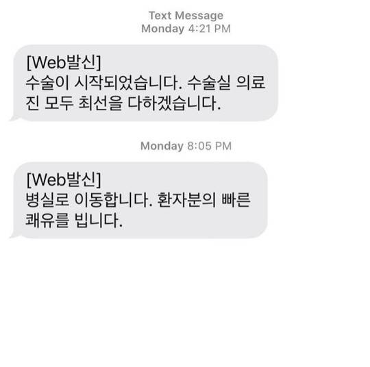 이와 함께 김수미는 병원에서 받은 문자 메시지를 캡처한 이미지도 공개했다. 캡처 이미지에는 "수술이 시작됐습니다" "병실로 이동합니다"라는 내용이 담겼다.