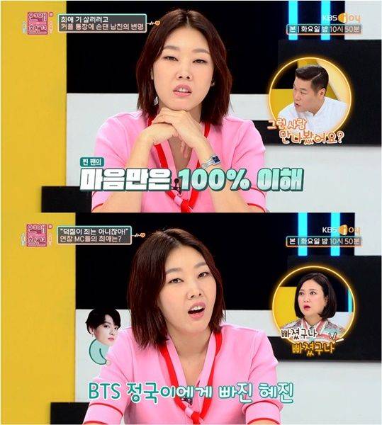 하지만 이 사연을 듣던 패널 한혜진은 "사실 남자친구의 마음이 이해된다"며 공감했는데요, "나도 방탄소년단 멤버 정국에게 빠져있다"며 공감의 이유를 밝혔습니다. 그는 "SNS에 저장한 영상만 500개가 된다. 매일 그것만 본다"고 말해 웃음을 자아냈습니다.