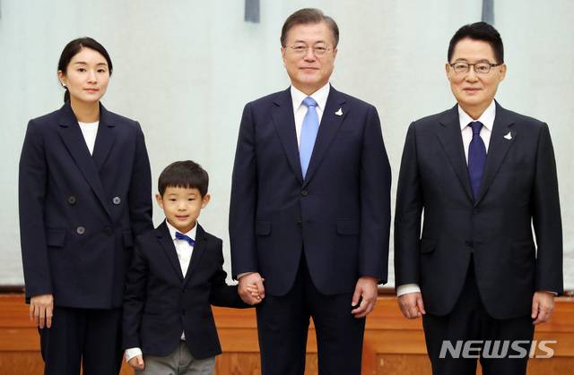 [서울=뉴시스]박영태 기자 = 문재인 대통령이 29일 청와대 본관에서 박지원 신임 국가정보원장에게 임명장을 수여한 후 박 국정원장의 손자 손을 잡고 기념촬영을 하고 있다. 왼쪽은 박지원 국정원장의 딸. 2020.07.29.