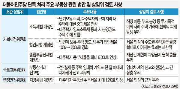 여당인 더불어민주당이 단독 처리한 부동산 관련 법안에 대해 중립적인 국회 보고서에서조차 “헌법상 과잉금지 원칙에 위배될 수 있다”는 등의 우려가 제기됐던 것으로 확인됐다. 민주당은 여러 부작용이 우려된다는 지적에도 적절한 조처 없이 일부 문구만 수정한 채 법안을 처리했다. 이에 따라 법안의 부작용이 현실화할 가능성도 커졌다.