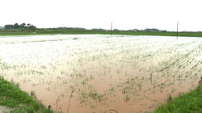 이틀간 127㎜의 비가 몰아치면서 8천㎡ 규모의 콩밭이 통째로 물에 잠겼는데 깊은 곳은 성인 무릎 높이까지 차올랐습니다.