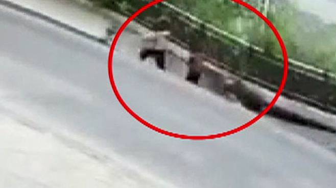 중국 서부 충칭시의 인도가 갑자기 큰 소리를 내며 무너져 내립니다.