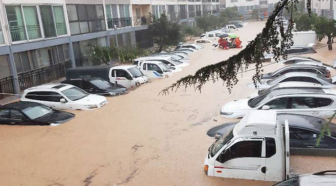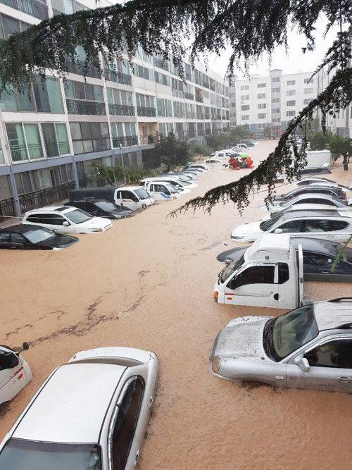30일 대전지역에 내린 집중 호우로 서구 정림동 한 아파트 주차장이 침수돼 있다.