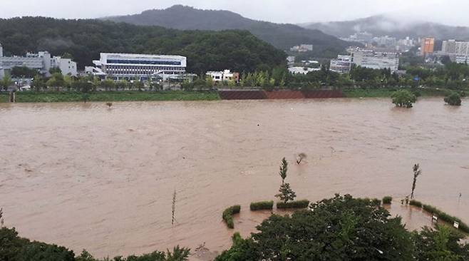 30일 새벽 대전지역에 쏟아진 폭우로 시내를 관통하는 갑천이 물바다로 변해 있다.