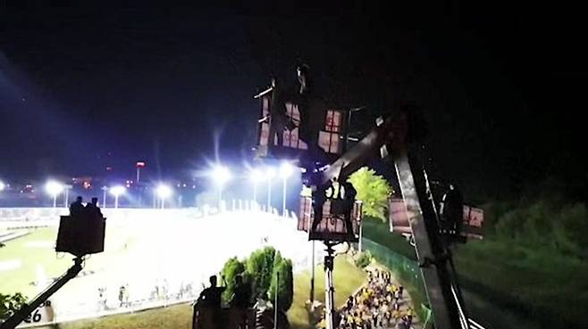 코로나19로 관중석 1만 3천 개 중 25%만 수용한다고 하자 팬들이 어떻게든 이 경기를 보기 위해서 크레인을 타고 온 겁니다.
