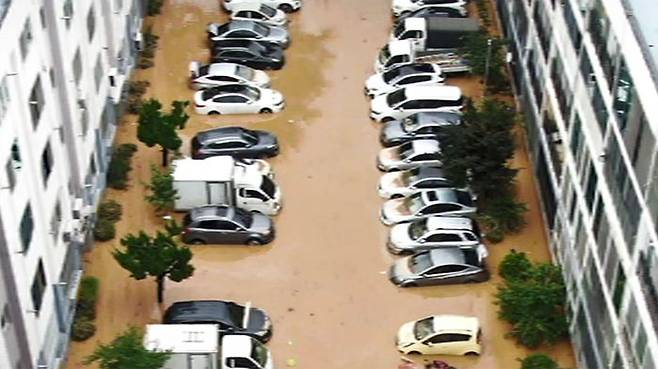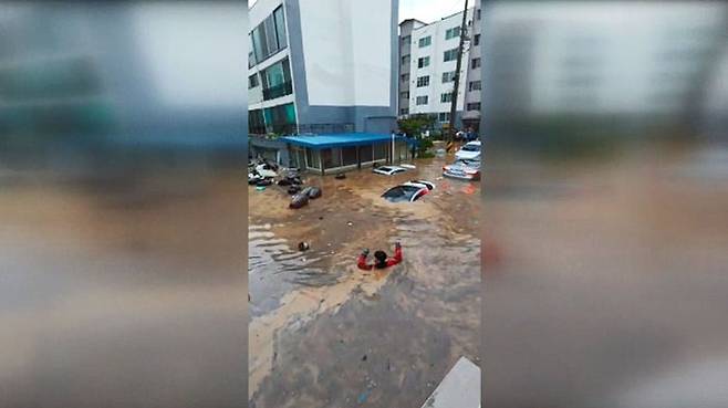 지상 주차장의 차들도 흙탕물에 처박히거나 둥둥 떠 저수지를 방불케 합니다.
