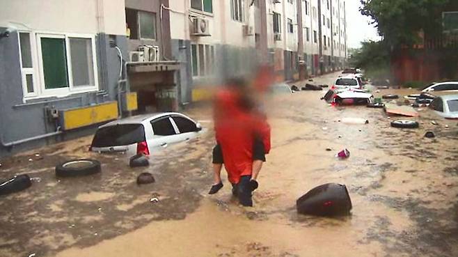 소방대원은 고무보트로 공동현관 위에 선 주민을 구조해 대피시키고, 그것도 여의치 않은 주민은 업어서 피신시켰습니다.