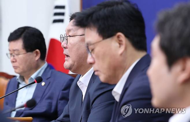 (서울=연합뉴스) 안정원 기자 = 더불어민주당 김태년 원내대표가 이해찬 대표를 대신해 31일 오전 서울 여의도 국회에서 최고위원회의를 주재하고 있다. 2020.7.31