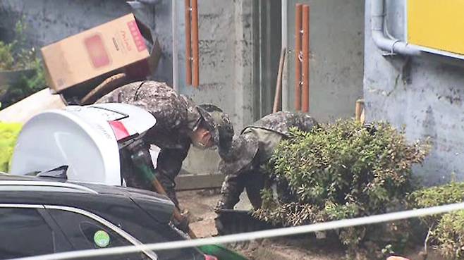 군 장병 30명이 마당을 뒤덮은 진흙을 삽으로 퍼내고 밀대로 긁어냅니다.