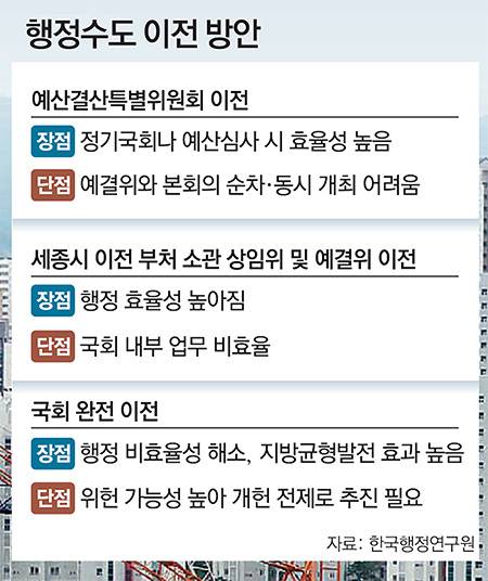 위헌 결정 당시와 상황이 달라졌다는 점도 이전 가능성을 높이고 있다. 2004년에는 세종시에 행정수도를 만들면 서울의 인구가 급속히 빠져나가면서 수도권이 공동화되고 집값이 폭락할 것이라는 우려가 컸다. 한 여당 의원은 “하지만 세종 이전 경험을 통해 일부 부처가 빠져나가도 서울이 전혀 타격을 입지 않는다는 걸 국민도 알게 됐다”며 “이명박 당시 서울시장처럼 행정수도 이전 반대 목소리를 높일 야권의 수도권 대선 주자도 없다”고 말했다.