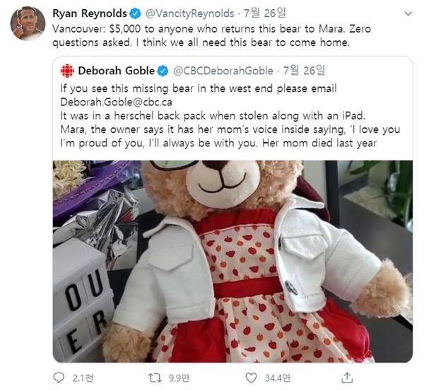 영화 '데드풀'에 출연한 밴쿠버 출신 할리우드 배우 라이언 레이놀즈도 선한 영향력을 보탰습니다. SNS에 "곰 인형을 소리아노 씨에게 돌려주는 사람에게는 묻지도 따지지도 않고 사례금으로 5천 달러(약 440만 원)를 주겠다"고 밝힌 겁니다. 해당 글은 10만 회 이상 공유되면서 소리아노 씨 사연은 더욱 널리 퍼졌습니다.
