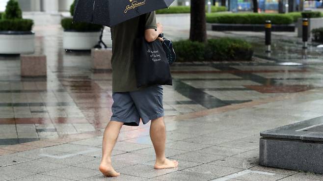 폭우에 신발이 젖어 한 시민이 맨발로 이동하고 있다.