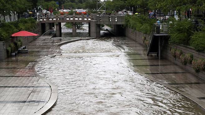 1일 정오경 서울 시내에 강한 빗줄기가 쏟아지자 시민들의 출입이 통제된 청계천에 물이 산책로 턱밑까지 차올라 있다.