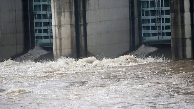 1일 오후 임진강 수위를 조절하며 방류하는 경기도 연천군 군남홍수조절댐. 경기도는 1일 임진강 최북단 필승교 수위가 행락객 대피 수위 1m를 넘었다며 수계인 연천·파주지역에 주의를 당부하는 재난 문자를 발송했다.