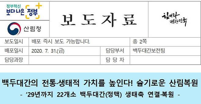 마침 산림청이 7월 31일자로 보도자료를 냈습니다. 제목은 '백두대간의 전통생태적 가치를 높인다! 슬기로운 산림복원'입니다. 도로 개설 등으로 훼손된 백두대간 생태축을 2029년까지 복원하겠다는 내용입니다. 산린청 심상택 산림보호국장은 보도자료에서 "백두대간은 생물다양성이 풍부하여 인문 사회, 자연 생태 등 전통적 가치와 생태적 가치가 매우 높은 지역"이라고 말했습니다. 물론 이번 송전탑 설치 후보지에 포함된 백두대간도 예외는 아니겠지요?